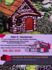 Handyman Kauai 808-855-0506 Handyman Princeville, Handyman Kapaa, Handyman Lihue, Handyman Koloa, Handyman Poipu, Handyman Kalaheo, Handyman Eleele, Handyman Waimea, Handyman Kekaha, Handyman , Plumber, Handymen, Repairman, Electrician, Repair, Renovation, Remodeling